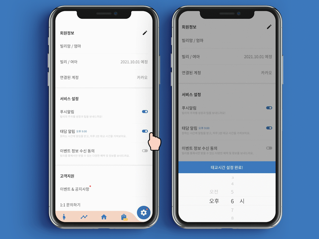 μλΉ κ° μνλ λ§μΆ€ μκ°λλ‘ νλ΄ μλ¦Όμ μ€μ ν μ μμ΄μ. νκ²½μ€μ μ λ€μ΄κ°μ νλ΄ μλ¦Όμ ON/OFF ν μ μμΌλ©°, μλ¦Ό μκ°λλ μλΉ κ° μνλ νλ΄ μκ°λλ‘ μ€μ ν΄μ!